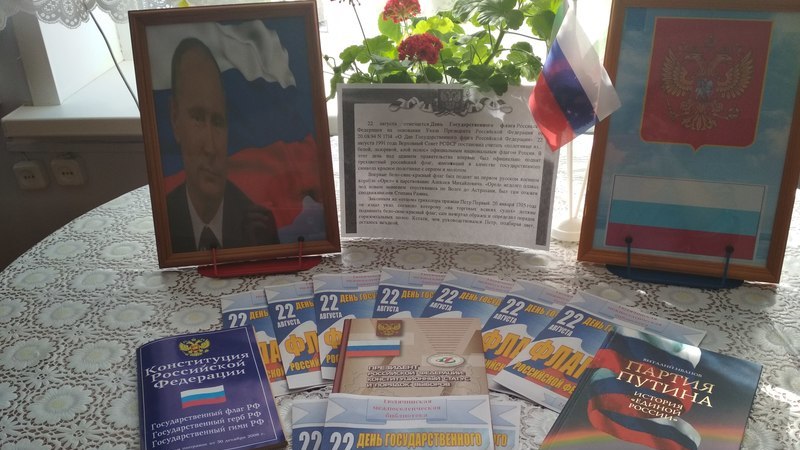 22 августа в читальном зале Тюлячинской межпоселенческой библиотеки оформлена информационная выставка «Во флаге слава страны» посвященная ко Дню Российского флага.