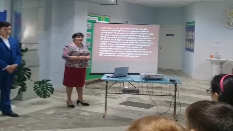 День солидарности в борьбе с терроризмом связан с трагическими событиями, произошедшими 1- 3 сентября 2004 года в городе Беслане. По этому случаю, сегодня в нашей школе проводился урок памяти. Учительница истории Д.Х.Зайнетдинова, применяя презентацию, ознакомила учеников с хроникой «Трагедия Беслана». Данное варварство, самый большой теракт , совершенный против детей, в человеческой истории. Мы не имеем право забыть об этом.
