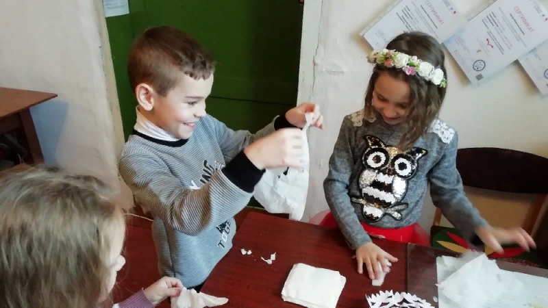 Затем ребята играли в игры. Мы устроили разнообразные конкурсы и в завершении провели мастер-класс по изготовлению поделок «Ангелочка» и "Новогодних снежинок".
