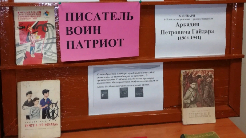 В Ачинской сельской библиотеке была оформлена книжная выставка, проведен обзор, рекомендательная беседа по книгам, " Писатели юбиляры месяца", она знакомит читателей с жизнью и творчеством юбиляра января 115 лет со дня рождения Аркадия Петровича Гайдара.