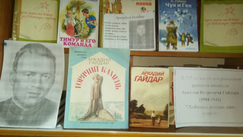 В связи с юбилеем писателя в Абдинской сельской библиотеке была оформлена книжная выставка "Любимых детских книг творец» и проведен обзор литературы, на которой были представлены уже знакомые и любимые ребятами книги «Тимур и его команда», «Чук и Гек» и другие.
