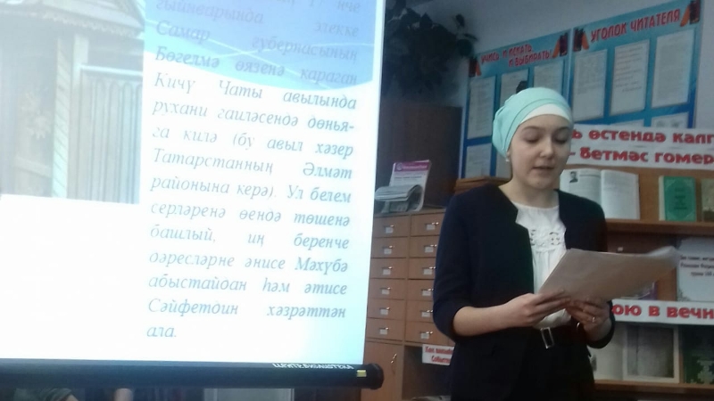 Учителя татарского языка М.Р. Сабирова, А.М. Гильфанова , Р.Р. Гарипова и ученица Тюлячинской средней школы Ситдикова Гуляндам приняли участие в мероприятии, посвященном великому ученому Ризаэтдину Фахретдину. В Тюлячинской межпоселенческой библиотеке, участникам мероприятия , Гуляндам рассказала о своем восприятии трудов великого ученого Ризаэтдина Фахретдина .
