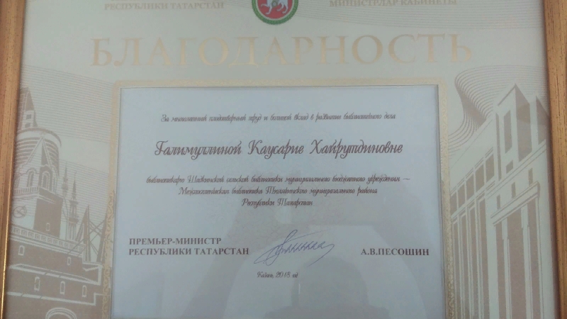 Библиотекарь Шадкинской сельской библиотеке Галимуллина Каусария Хайрутдиновна награждена блогодарностью Министра Кабинетов Республики Татарстан.