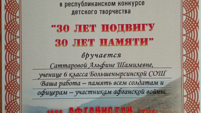 Самая активная читательница Айдаровской сельской библиотеки Альфина Саттарова участвовала в творческом конкурсе "30 лет подвигу, 30 лет памяти", проводимой Республиканской детской библиотекой.