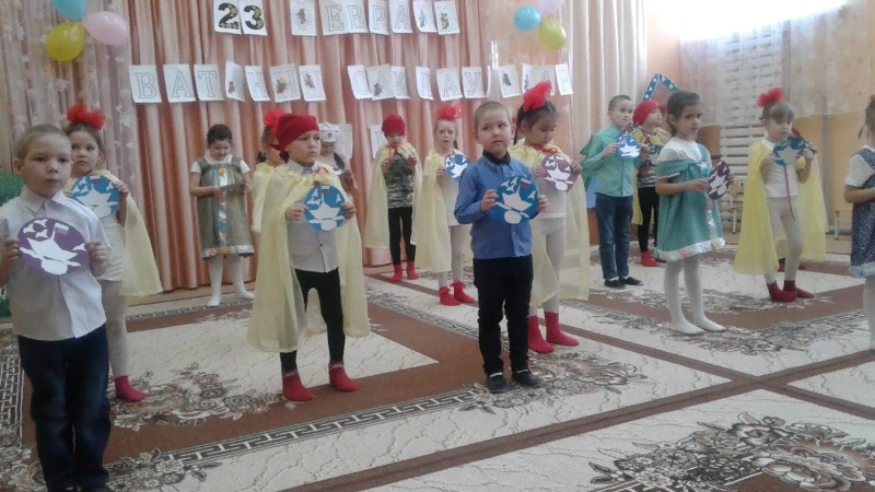 На празднике присутствовали папы, дедушки, братья воспитанников. Дети пели песни и читали стихи о защитниках России, танцевали. В завершении праздника дети вручили родителям подарки.