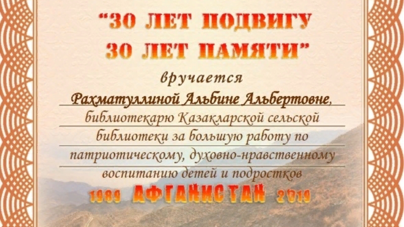 В честь этого был объявлен республиканский конкурс под названием: «30 лет подвигу, 30 лет памяти». Организаторами конкурса являются –Военный Комиссариат Республики Татарстан, Государственное бюджетное учреждение культуры РТ «Республиканская детская библиотека», Татарстанское отделение Всероссийской общественной организации ветеранов «Боевое братство». Казакларская сельская библиотека тоже присоединилась к этому конкурсу и была награждена Благодарственным письмом за участие.