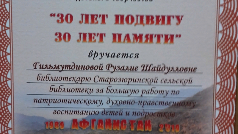 В честь этого был объявлен республиканский конкурс под названием: «30 лет подвигу, 30 лет памяти». Организаторами конкурса являются – Военный Комиссариат Республики Татарстан, Государственное бюджетное учреждение культуры РТ «Республиканская детская библиотека», Татарстанское отделение Всероссийской общественной организации ветеранов «Боевое братство». Старозюринская сельская библиотека тоже присоединилась к этому конкурсу и была награждена Благодарственным письмом за участие.