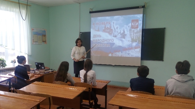 В целях усиления традиций народного единства и сплочения, воспитания у учащихся патриотизма, уважения к истории и традициям нашей Родины, отдавая дань великому историческому прошлому России 29 октября в школе был проведен День народного единства. Учителем обществознания Хасановой А.М. проведен исторический час «Героями ты славишься, Россия!». К уроку была подготовлена презентация о героях народного ополчения Д. Пожарском и К. Минине, о Смутном времени. На уроке ребята рассуждали о патриотизме, нравственности, ответственности, любви к своей Родине.