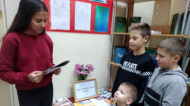 4 ноября – ко Дню народного единства в Казакларской сельской библиотеке была проведена беседа с детьми и обзор выставки под названием "Бергә булыйк, бердәм булыйк". Библиотекарь рассказала ребятам об истории праздника, о дружбе и единстве между народами разных национальностей. Дети читали стихи о дружбе.