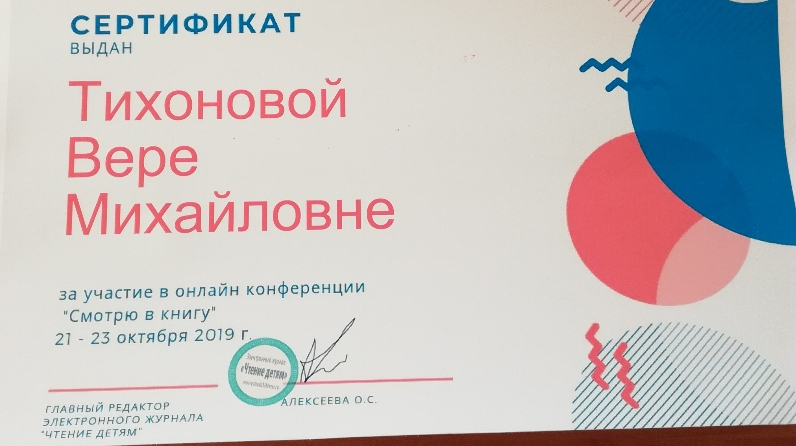21-23 октября библиотекарь Ачинской сельской библиотеки Тихонова В.М  приняла участие в онлайн конференции "Смотрю в книгу" и  получила Сертификат.