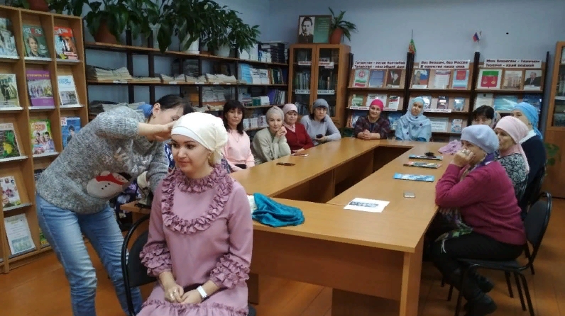 Встреча была посвящана головным уборам женщин - платкам, шалям. Мероприятие библиотекари начали с знакомства с историей платка. Платки, шали часто упоминаются и в литературных произведениях, в песнях нашего народа. На вечере прозвучало произведение “Ак яулык” Дании Гайнутдиновой. Айгуль Гатауллина и Альбина Салихова продемонстрировали различные способы вязания платка. Что ни говори, платок украшает женщин, создает свой неповторимый образ.