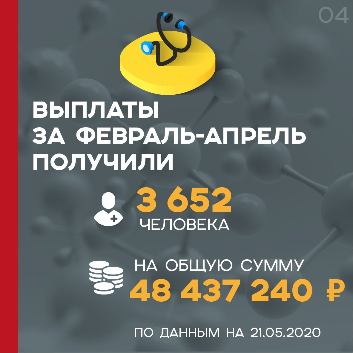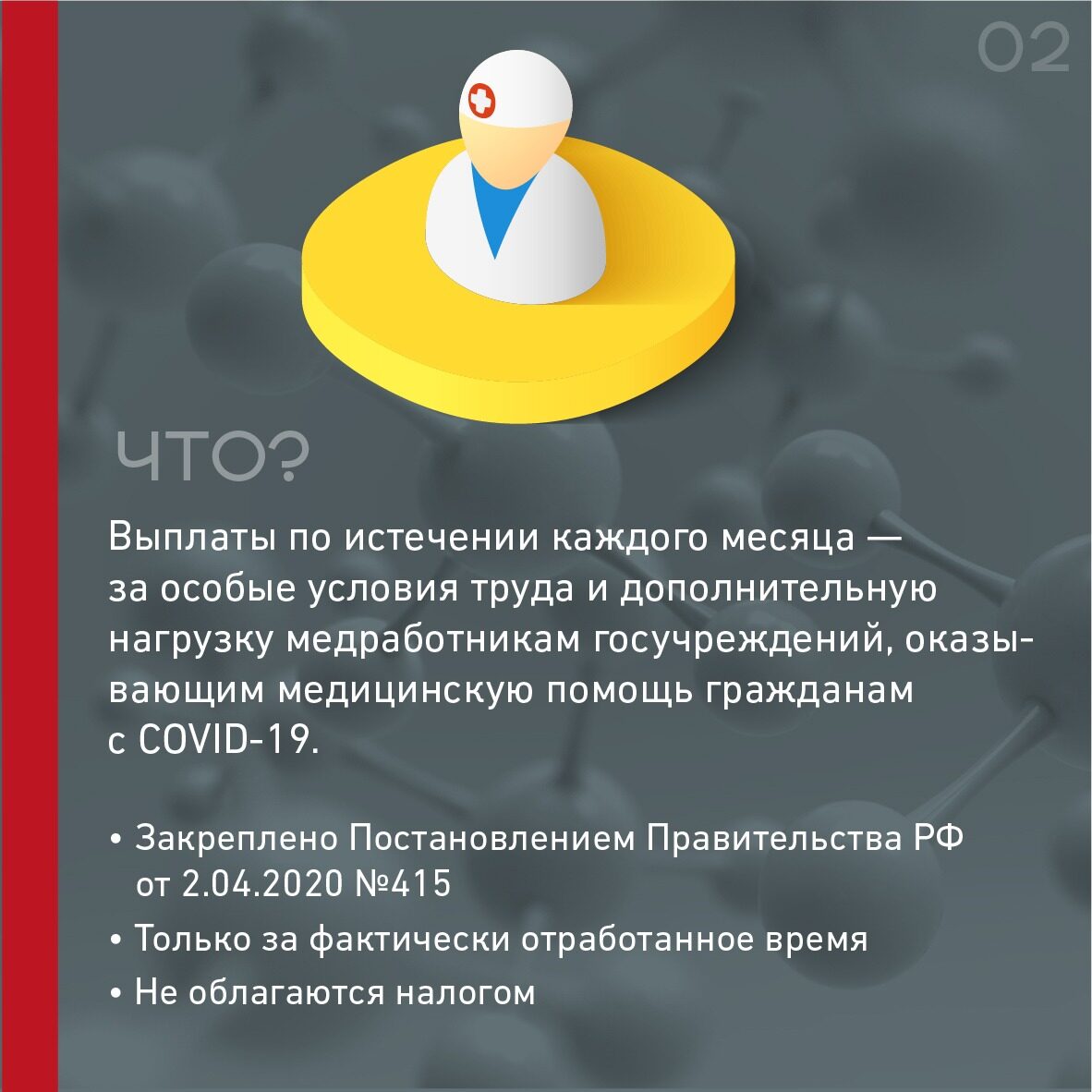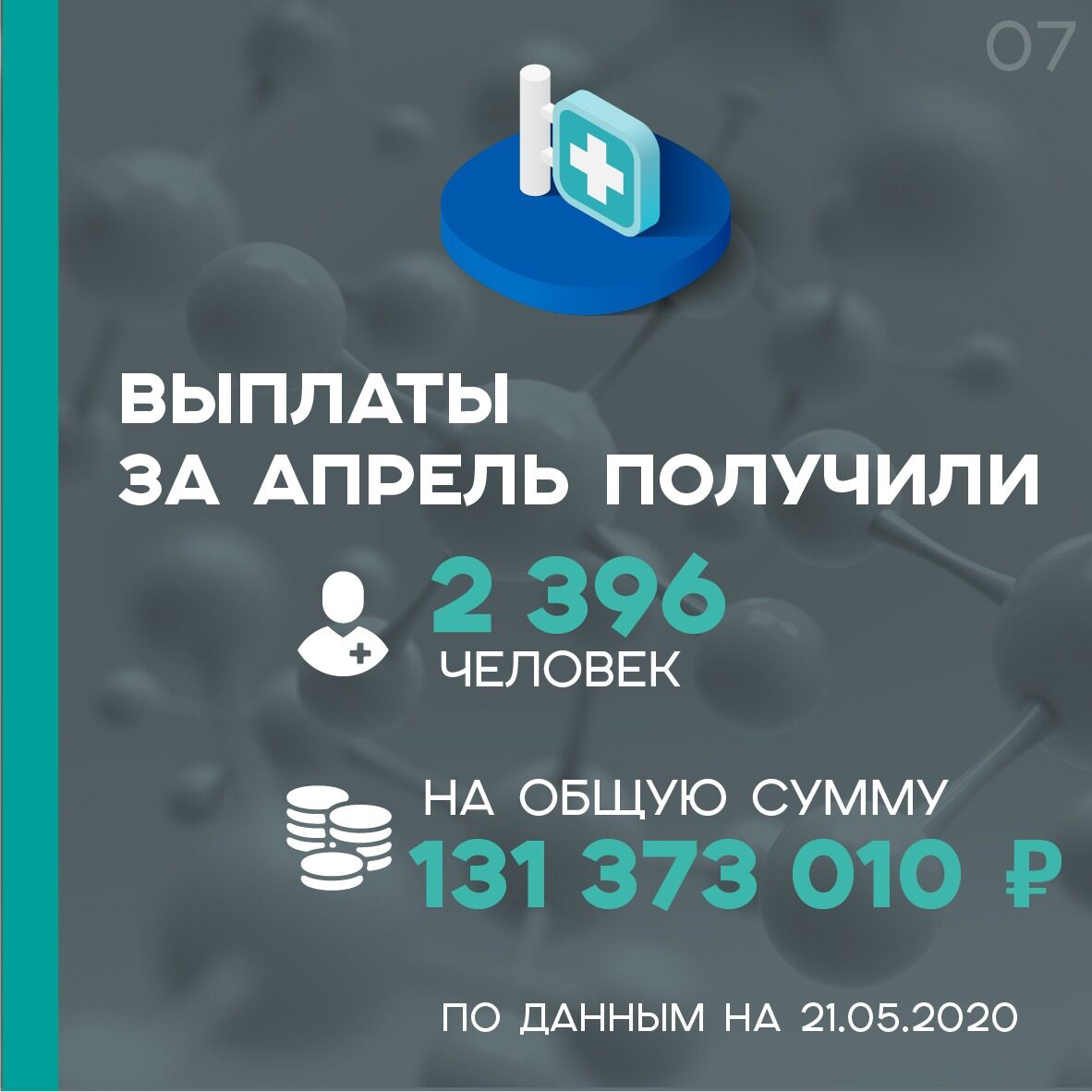 В соответствии с распоряжением Президента РФ В. Путина в апреле были установлены доплаты за особые условия труда работников здравоохранения, оказывающих помощь больным с новой коронавирусной инфекцией.