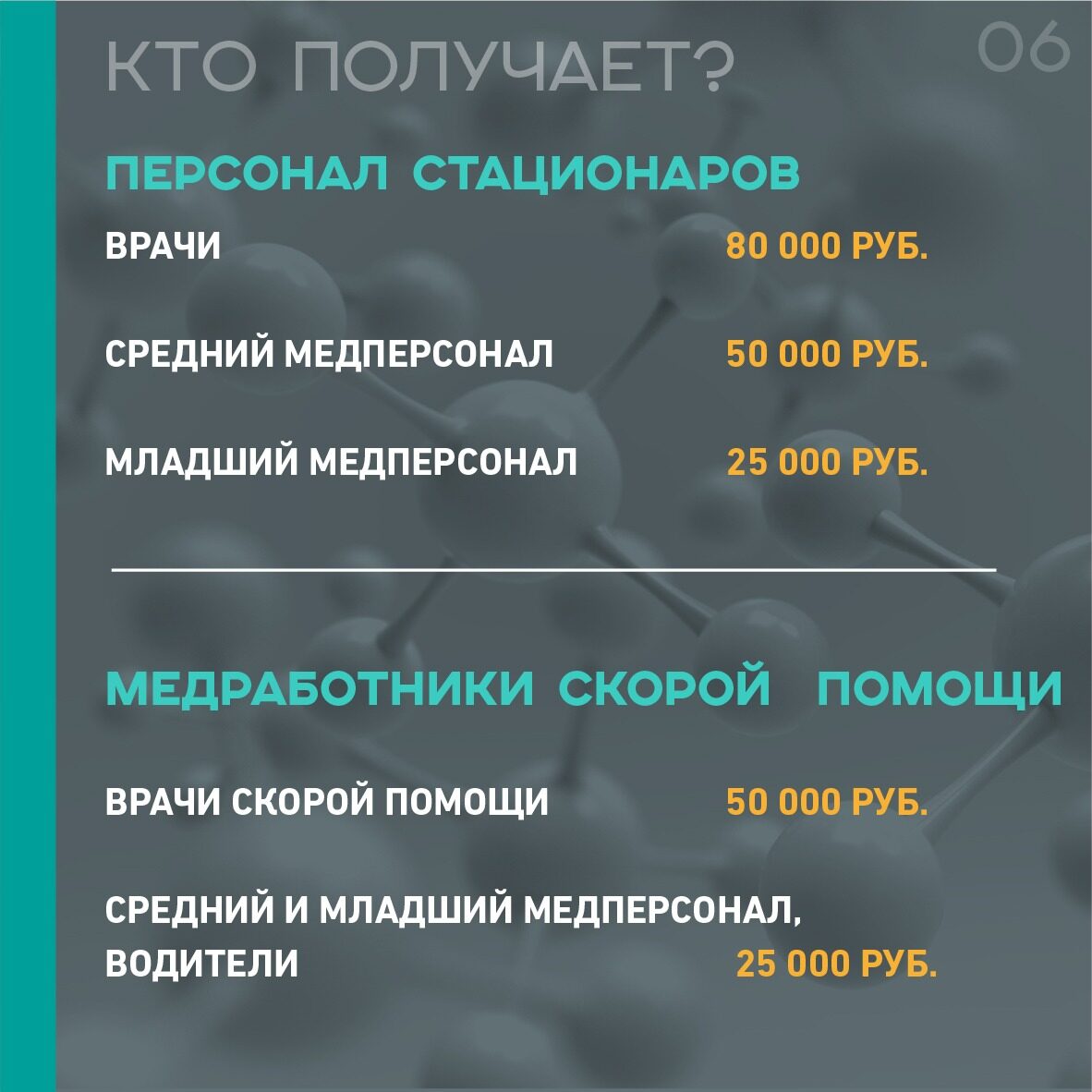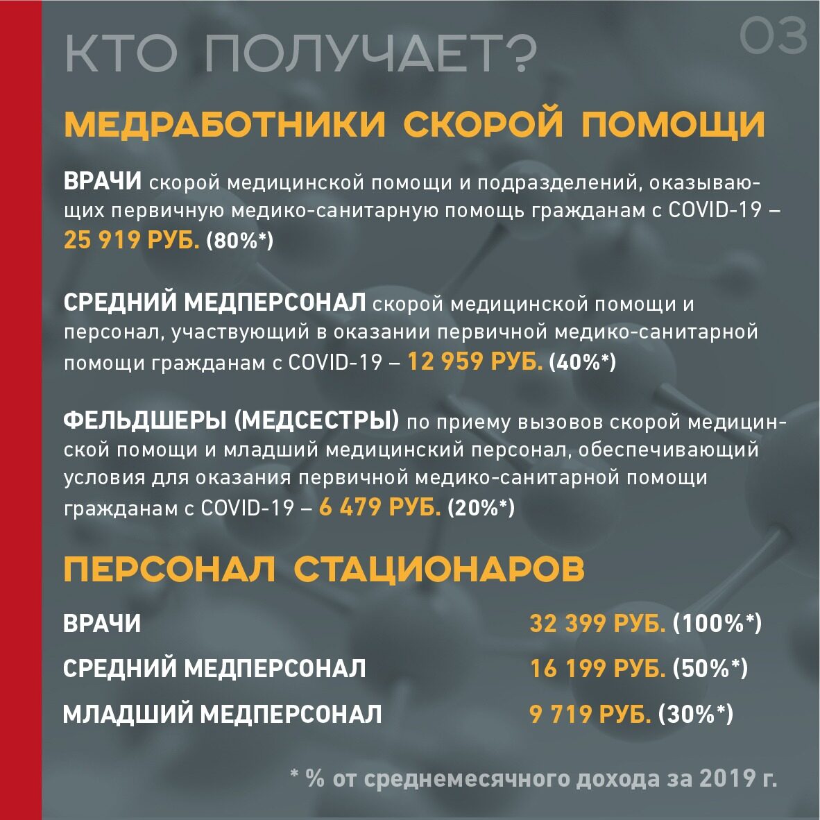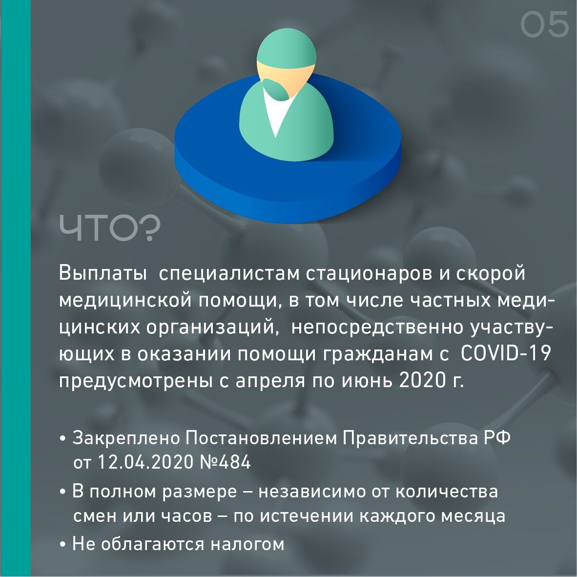 В соответствии с распоряжением Президента РФ В. Путина в апреле были установлены доплаты за особые условия труда работников здравоохранения, оказывающих помощь больным с новой коронавирусной инфекцией.