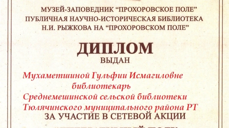 Библиотекарь Среднемешинской сельской библиотеки Мухаметшина Гульфия Исмагиловна приняла участие в акции «Литературный полк Пушкинских героев», посвященной Дню Пушкина и получила Диплом. Организатор акции-научно-историческая библиотека имени Н.И.Рыжкова на «Прохоровском поле».