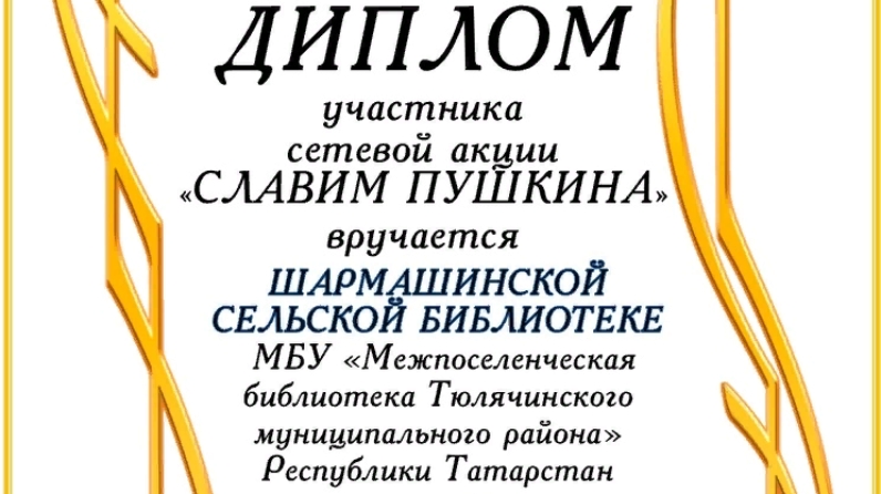 Шармашинская сельская библиотека присоединилась к акции, посвященной Пушкинскому дню в России, и предложила вниманию прочтение произведения "Я памятник себе воздвиг нерукотворный" Залалтдиновым Амиром, учащимся 1г класса гимназии № 40. Организатор акции - Детско-юношеская библиотека №7 МБУ "Библиотечно-информационная система" г. Нижневартовска.