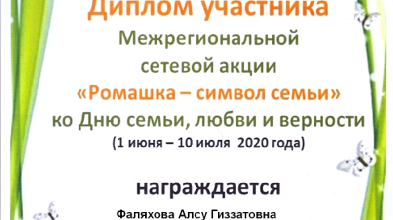 Айдаровская сельская библиотека приняла участие межрегиональной сетевой акции «Ромашка-символ семьи» и получила диплом за участие. Организатор акции: Централизованная библиотечная система г. Пскова. Цель акции: привлечение внимание к чтению книг, продвижение семейного чтения, семейных традиций и духовно-нравственных ценностей.