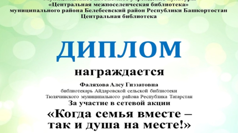 Айдаровская сельская библиотека присоединялась к сетевой акции «Когда семья вместе - так и душа на месте", посвящённой приближающемуся празднику Дню семьи, любви и верности и награждена дипломом. Организатор сетевой акции: Центральная межпоселенческая библиотека" Белебеевского района Республики Башкортостан. Цель этой акции: Развитие и поддержка интереса к чтению книг о семье и семейных ценностях.
