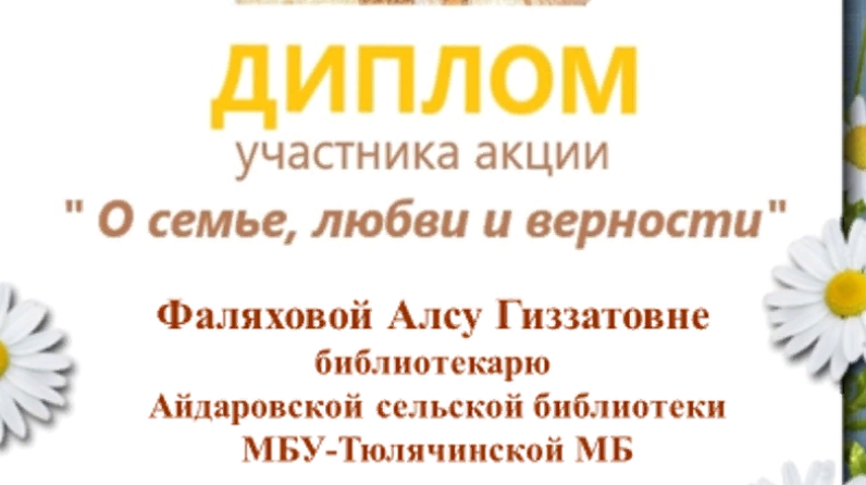 Фаляхова Алсу Гиззатовна, библиотекарь Айдаровской сельской библиотеки Тюлячинского муниципального района РТ, приняла участие в сетевой акции "О семье, любви и верности" и награңдена Диплом. Организатор акции - МАУК «ЦМБ» Белебеевского района РБ Поселенческая библиотека № 3 с детским отделением.