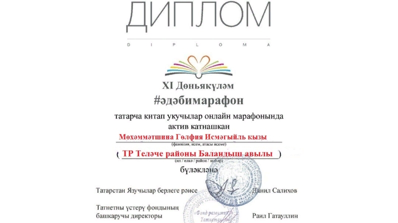 Урта Мишә авыл китапханәчесе Мөхәммәтшина Гөлфия Исмәгыйль кызы XI нче Дөньякүләм үтүче, татарча китап укучылар онлайн марафонында актив катнашканы өчен Диплом белән бүләкләнде.