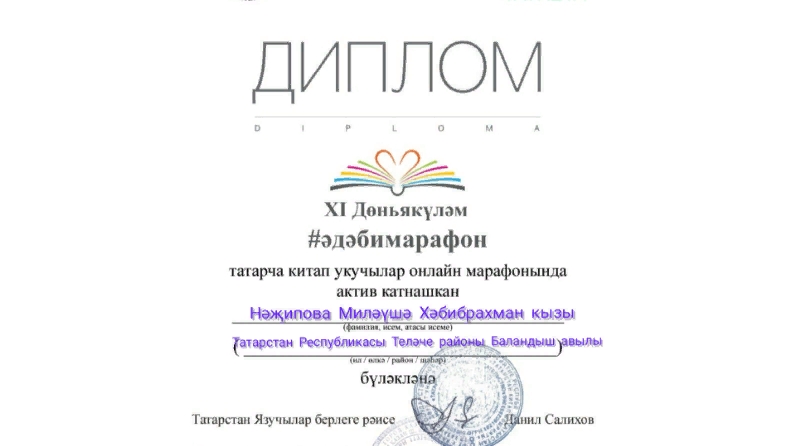 Библиотекарь Баландышской сельской библиотеки Назипова Миляуша участвовала в Всероссийском онлайн-проекте «Литературный марафон» и была награждена Дипломом.