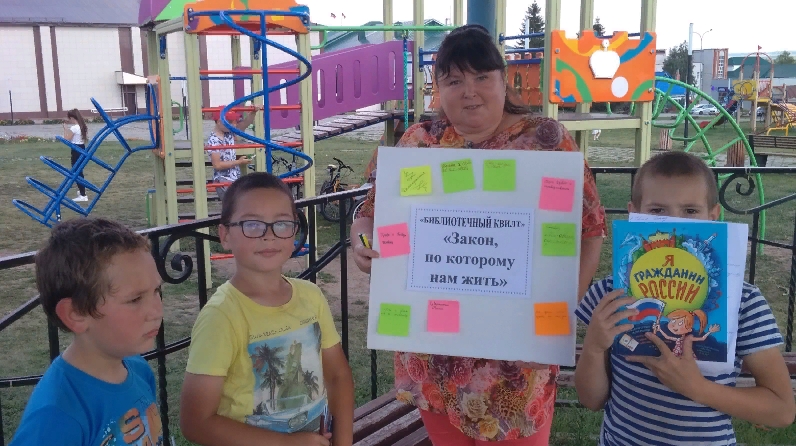 Мы, библиотекари, творческие люди, иногда выдумываем что-то интересное для наших читателей, а иногда берем какую-то идею за основу и применяем в своей работе. Одна из таких форм – это «квилт». Суть библиотечного квилта в том, чтобы составить плакат из лоскутков по определенной теме. В данном случае, это тема – законы. Каждый участник смог поучаствовать в его наполнении. Ребята дополняли названия законов своим представлением о них, в итоге получилось «лоскутное полотно» с множеством интересных высказываний и мнений.