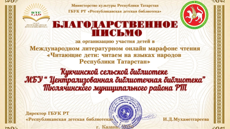Кукчинская сельская библиотека приняла участие в Международном литературном онлайн марафоне чтения «Читающие дети: читаем на языках народов Республики Татарстан», в честь празднования 100-летия образования Республики Татарстан и получила Диплом за участие.