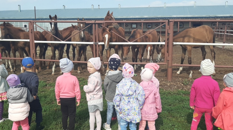 С целью закрепления полученных знаний, по пройденной теме «Домашние животные», развития познавательной активности и воспитания бережного отношения к животным, в средней группе Тюлячинского детского сада №1 была организована поездка на коневодческую ферму С. Гиниятуллина. В ходе экскурсии мы повторили с детьми знания о лошадях и узнали кое-что нового.Чем лучше питание и уход, тем крупнее становится лошадь. Размер лошади также зависит от ее породы. На данной ферме есть татарские, арабские и английские породы лошадей. Некоторые из них настоящие спортсмены, которые участвуют в различных соревнованиях и привозят награды. Ребятам запомнилась кобыла с очень необычной окраской (мастью) по прозвищу Айсинг – Маннока, у него больше всего наград.Есть большие лошади – тяжеловозы. Они перевозят тяжелые грузы. Есть совсем маленькие лошади – пони.Также проговорили и о применении лечебного метода – иппотерапии, который основан на взаимодействии человека с лошадью.Заглянули мы и в конюшни, узнали, чем кормят лошадей, как за ними ухаживают и содержат.В одном из вольеров мы увидели маленького жеребенка молочного цвета, ребята прозвали его «Сгущенкой». Дети были очень удивлены тем, что жеребята тоже болеют и им также делают уколы и запрещают «гулять». На прощание ребята пожелали ему скорейшего выздоровления и угостили морковкой. Дети получили огромное удовольствие от экскурсии и вернулись в садик со счастливой улыбкой на лице.