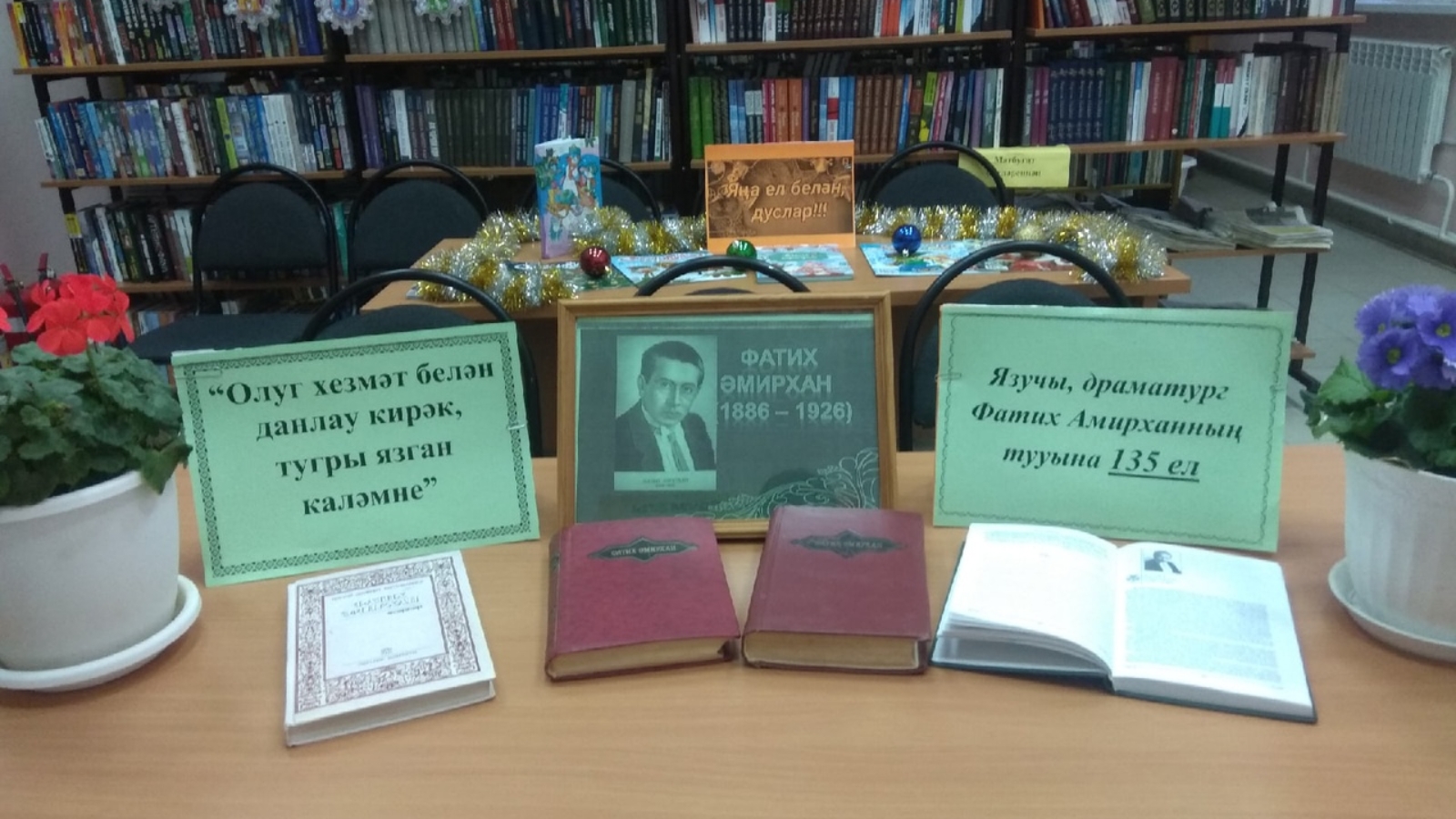 В Шадкинской сельской библиотеке с 5 января, в связи со 135-летием со дня рождения писателя, драматурга, критика Фатиха Амирхана, начала работу тематическая полка под названием " Олуг хезмәт белән данлау кирәк тугры язган каләмне ".