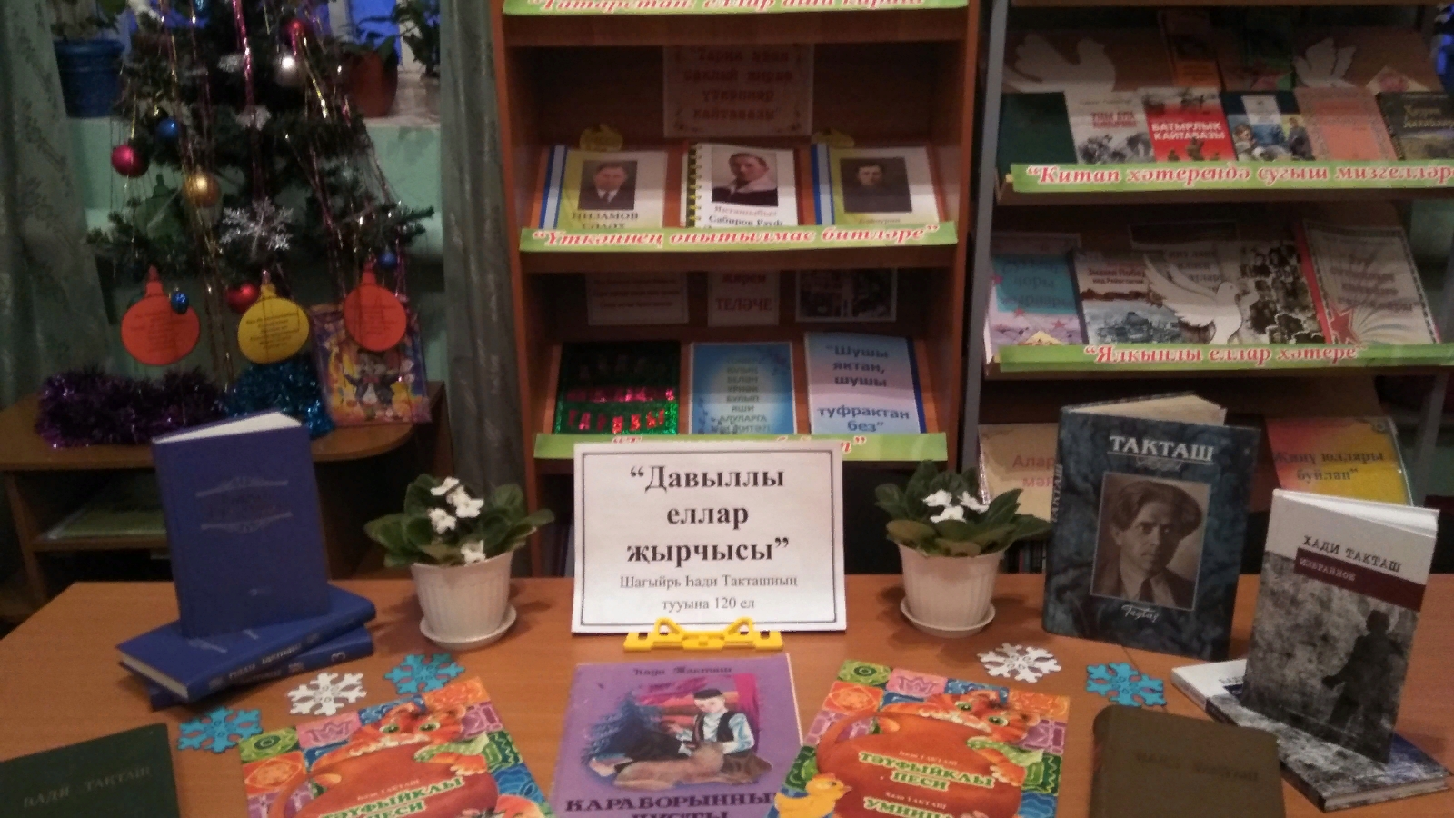 1 января в Айдаровской сельской библиотеке к 120-летию со дня рождения татарского поэта Хади Такташа, творчество которого занимает важное место в татарской литературе, оформлена книжная выставка под названием “Давыллы еллар җырчысы”. На выставке представлены различные издания произведений поэта и книги о его жизни.