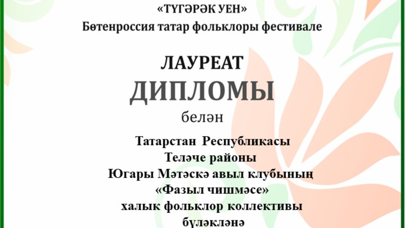 За участие в Всероссийском фестивале татарского фольклора народный фольклорный коллектив "Фазыл чишмәсе" Верхнеметескинского сельского клуба был награждён дипломом Лауреата.