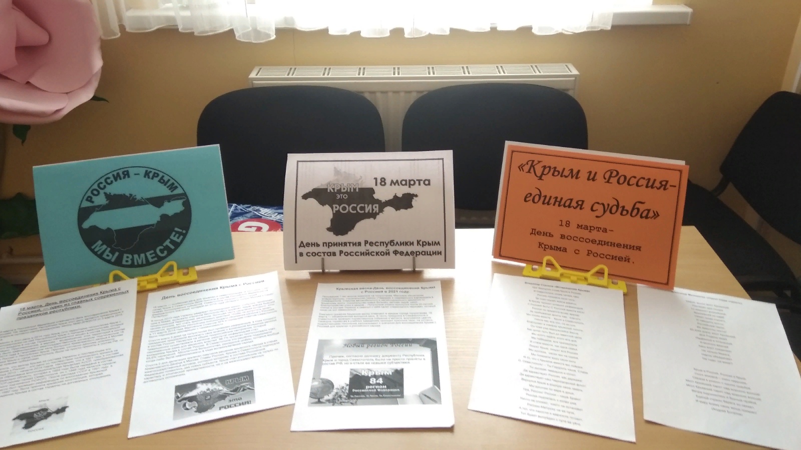18 марта, в рамках Всероссийской акции «Крымская весна», приуроченной к празднованию семилетней годовщины воссоединения Крыма с Россией в Айдаровской сельской библиотеке организована информационная выставка «Крым и Россия - единая судьба». На выставке представлены материалы, рассказывающие об истории Крыма, о том, как происходило воссоединение с Россией, а также стихотворения, посвященные Крыму.