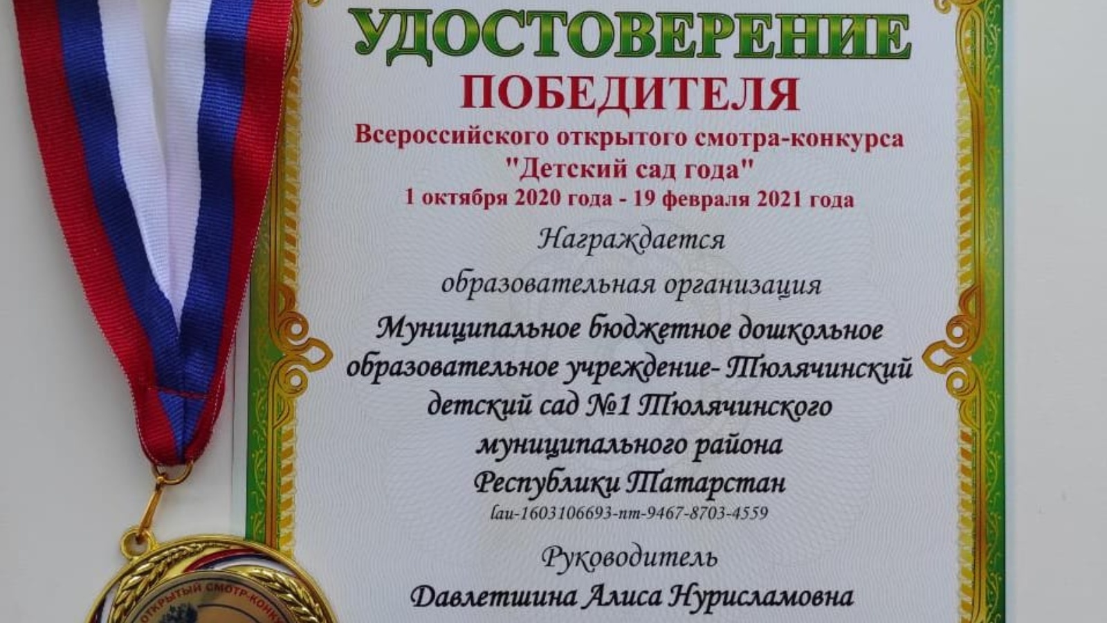 МБДОУ- Тюлячинский детский сад №1 вошел в список единого реестра Лауреатов-Победителей открытого Всероссийского смотр - конкурса 2021 «Детский сад года».