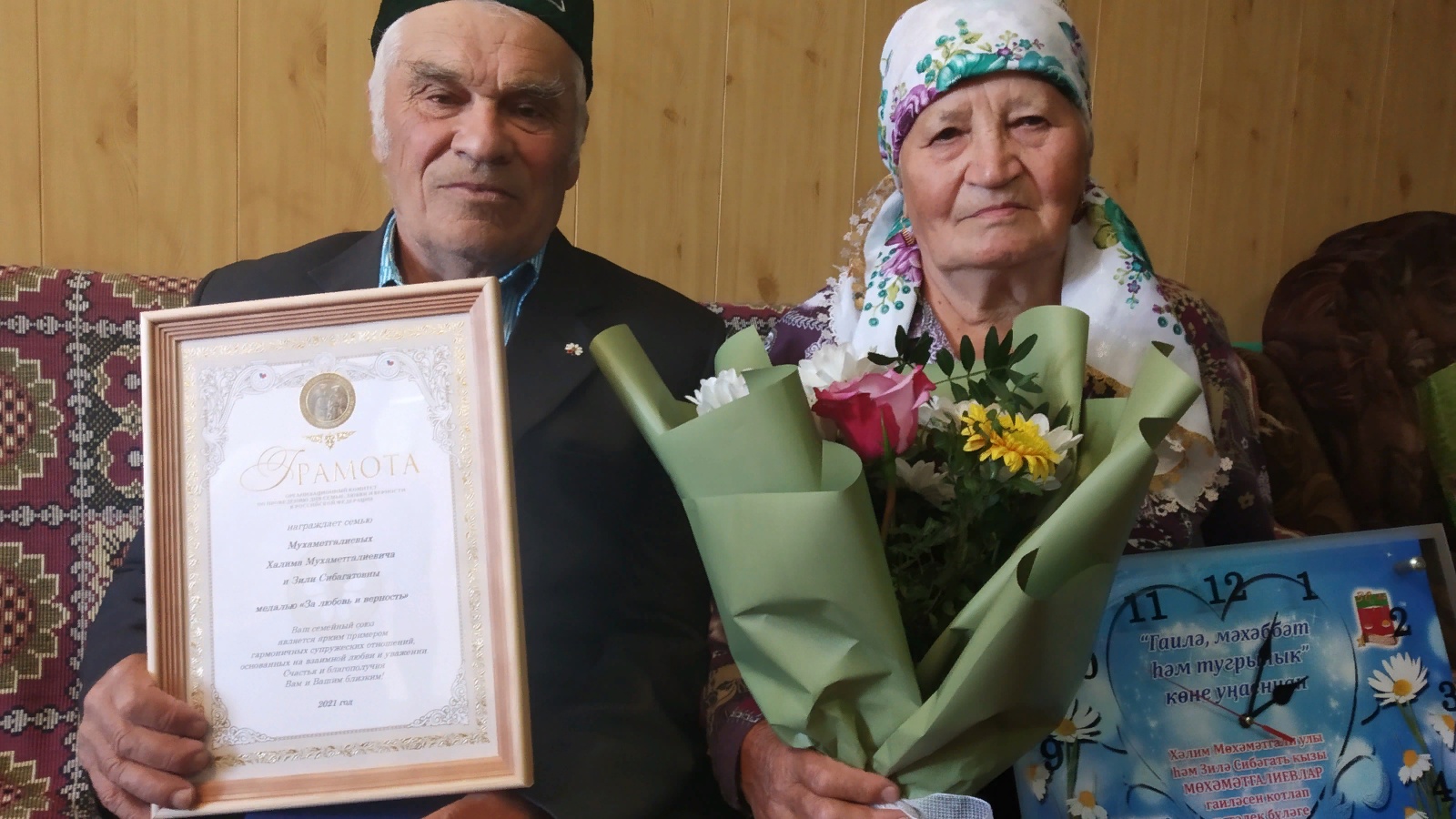 Такой наградой была награждена семья Махаматгалиевы из села Большие Савруши. Халим Махаматгалиевич и Зиля Сибагатовна совместно прожили в браке 59 лет. Всю трудовую деятельность посвятили родному колхозу. Вырастили троих прекрасных детей.