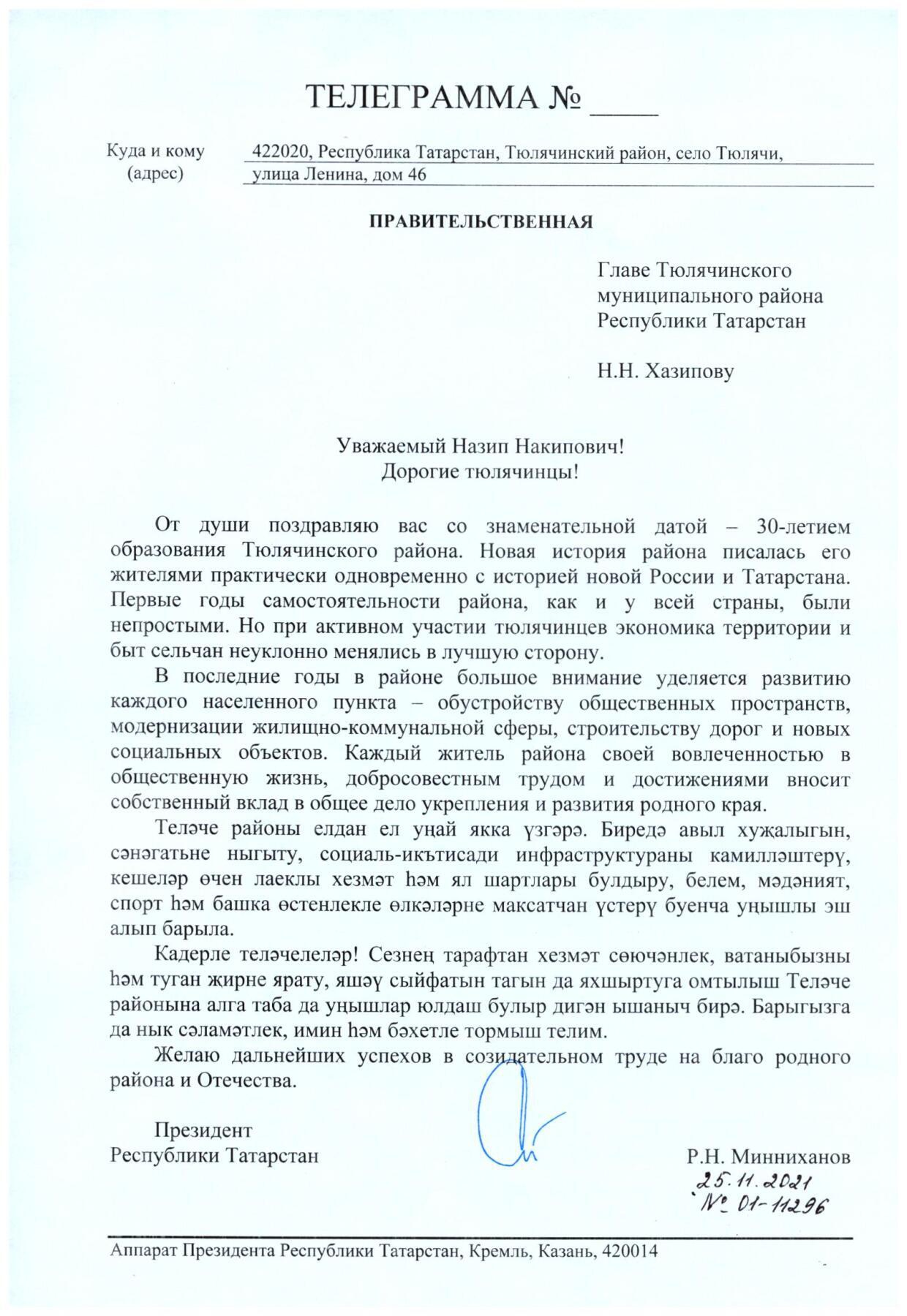 Президент Республики Татарстан поздравил с 30-летием образования Тюлячинского района