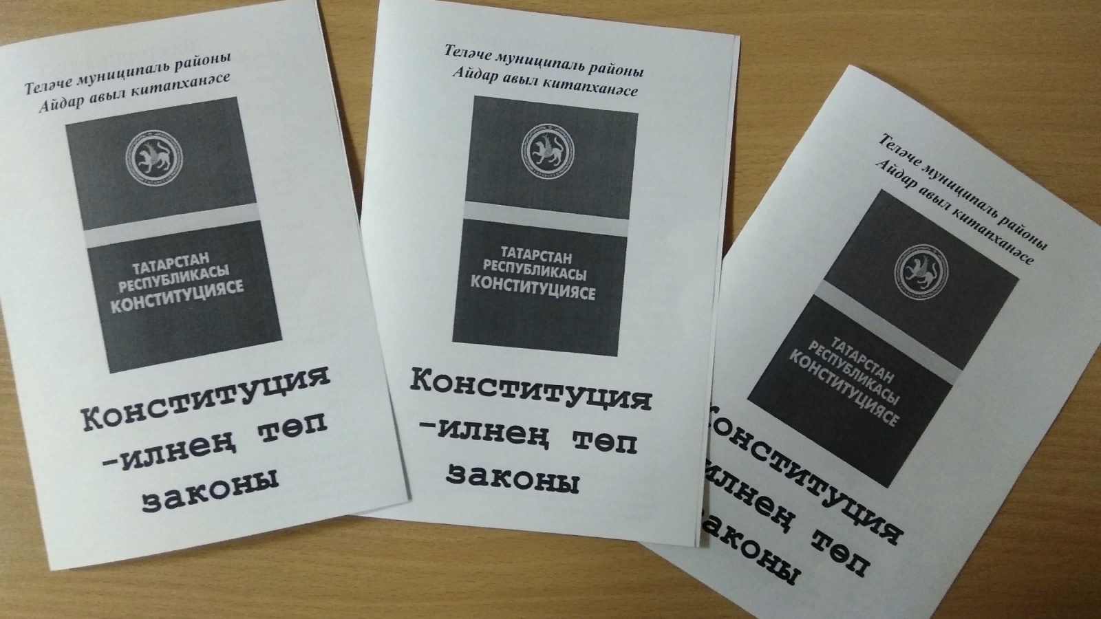 В республике имеется несколько торжеств, которые очень значимы для Татарстана. Одной из таких дат является 6 ноября, когда отмечается День Конституции. В ноябре 1992 года был разработан Конституционный документ Республики Татарстан. В Айдаровской сельской библиотеке, к этому дню был подготовлен буклет "Конституция –илнең Төп законы". Здесь есть все о главном и основном документе нашей республики, ее богатой истории, традициях.