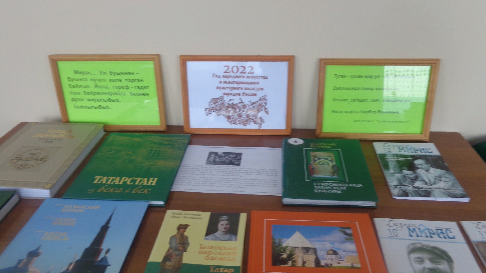 В Саушской сельской библиотеке в честь 2022 года - Года культурного наследия народов России была выставлена книжная выставка на тему "Мәдәни мирасыбыз - безнең киләчәгебез”.