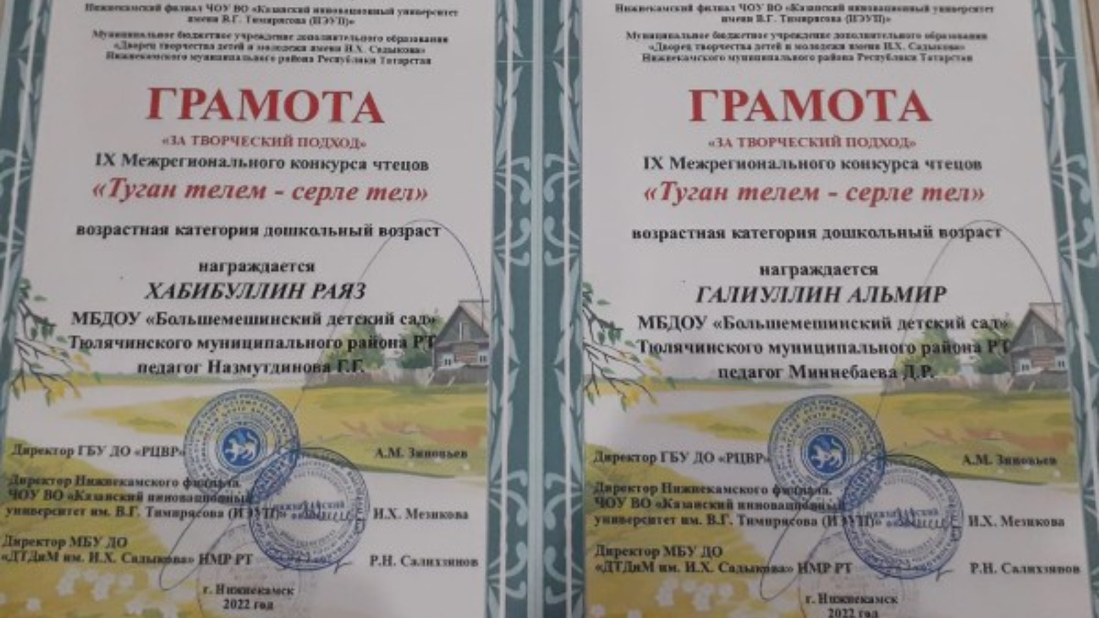 На днях стали известны итоги очередного конкурса. Хабибуллин Р. и Галиуллин А. награждены Почетной грамотой IX Межрегионального интернет-конкурса “Туган телем - серле тел” среди своих сверстников в номинации «Родной край – колыбель мелодий». Оба читали наизусть стихи поэтов-земляков.