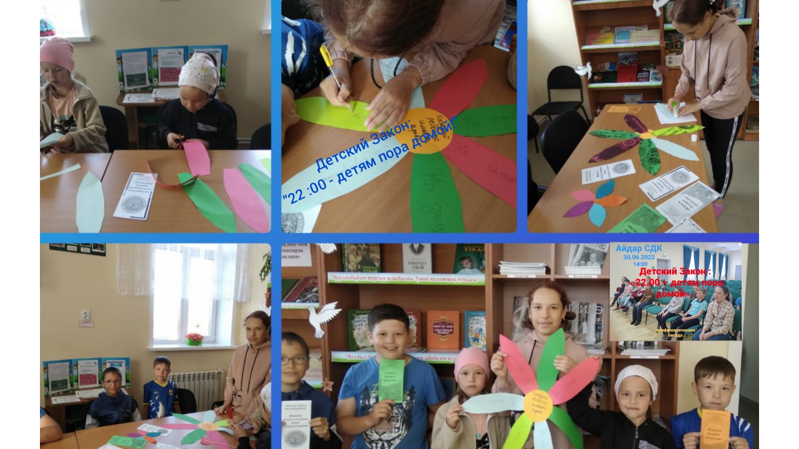 Каждый несовершеннолетний знает: «Закон такой: 22:00 — детям пора домой» и в большинстве случаев стремится не находиться в ночное время суток вне дома. Эффективность«детского» закона очевидна. Целью настоящего Закона является создание правовой основы для защиты жизни и здоровья несовершеннолетних, профилактики их безнадзорности и правонарушений в соответствии с Конституцией Российской Федерации, федеральным законодательством и общепризнанными нормами международного права. Айдаровский сельский дом культуры совместно с библиотекой 30 июня 2022 года провели профилактическую беседу "Детский Закон : 22:00-детям пора домой".