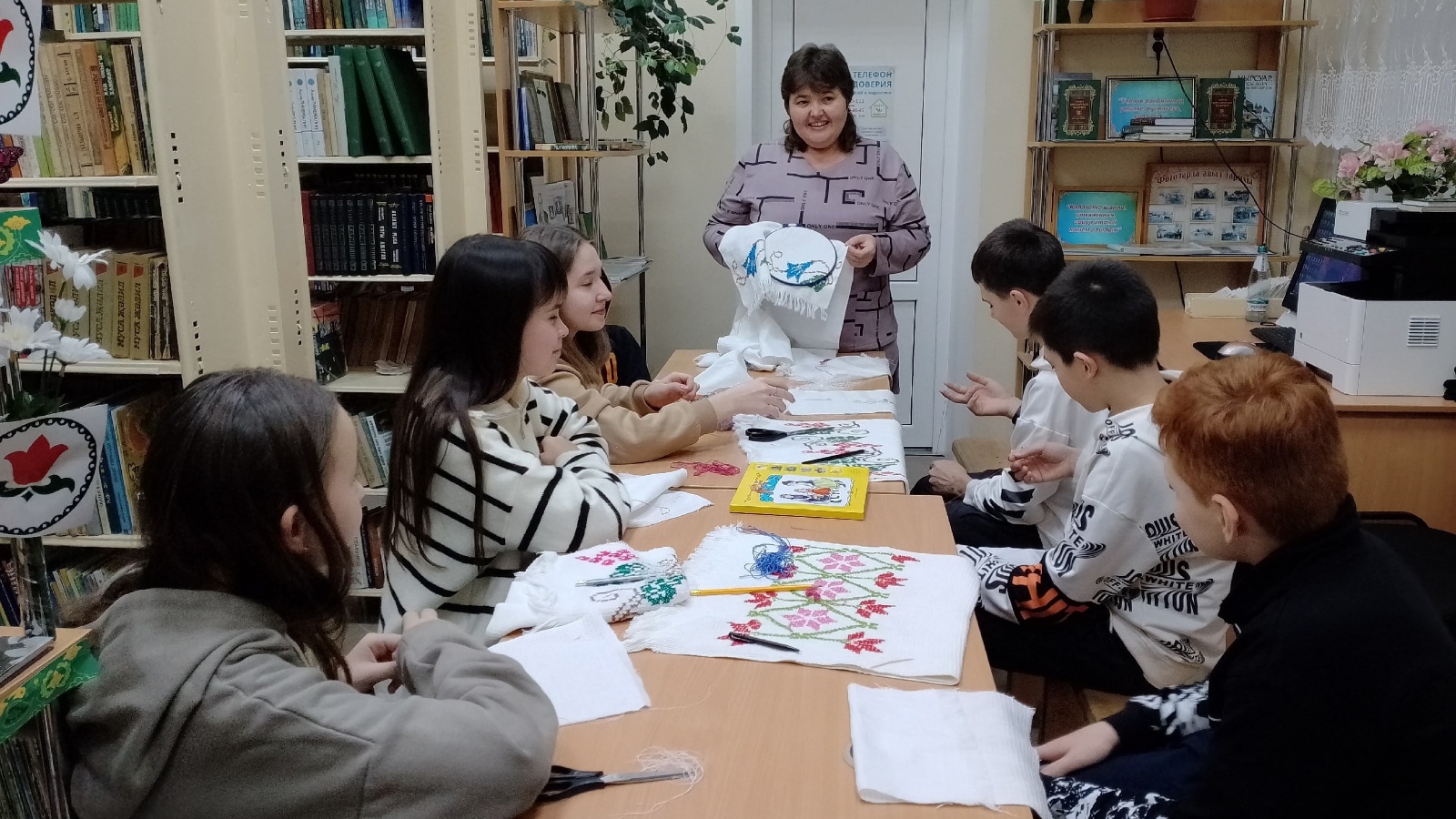 Библиотекарь Альбина Рахматуллина познакомила с помощью книг, находящихся в фонде библиотеки, с историей вышивания, с основными татарскими узорами и цветовой гаммой нитей. Был сделан обзор выставки из вышитых полотенец, платочков и скатертей. В ходе мастер-класса подростки закрепили полученные знания на практике и самостоятельно вышивали узоры.