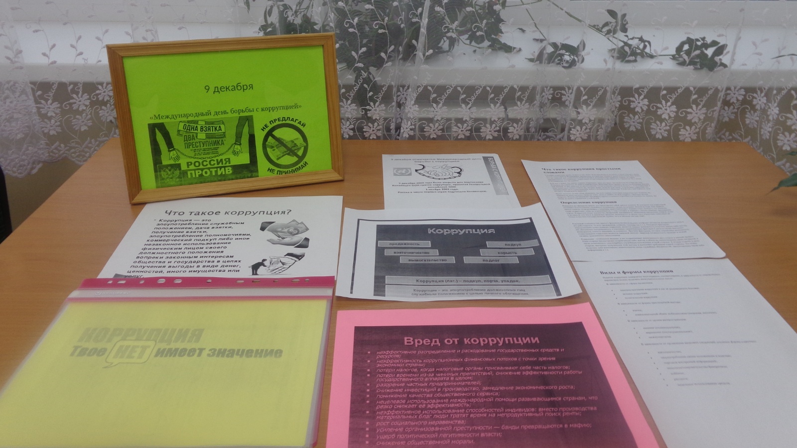 4 декабря в Саушской сельской библиотеке была представлена книжная выставка «Вместе против коррупции". Для ознакомления читателям были представлены статьи из федеральных, республиканских и местных периодических изданий, в которых рассказывается о коррупции. Посетители библиотеки узнали о мерах борьбы с этим явлением, о том, какие наказания грозят нарушителям закона.