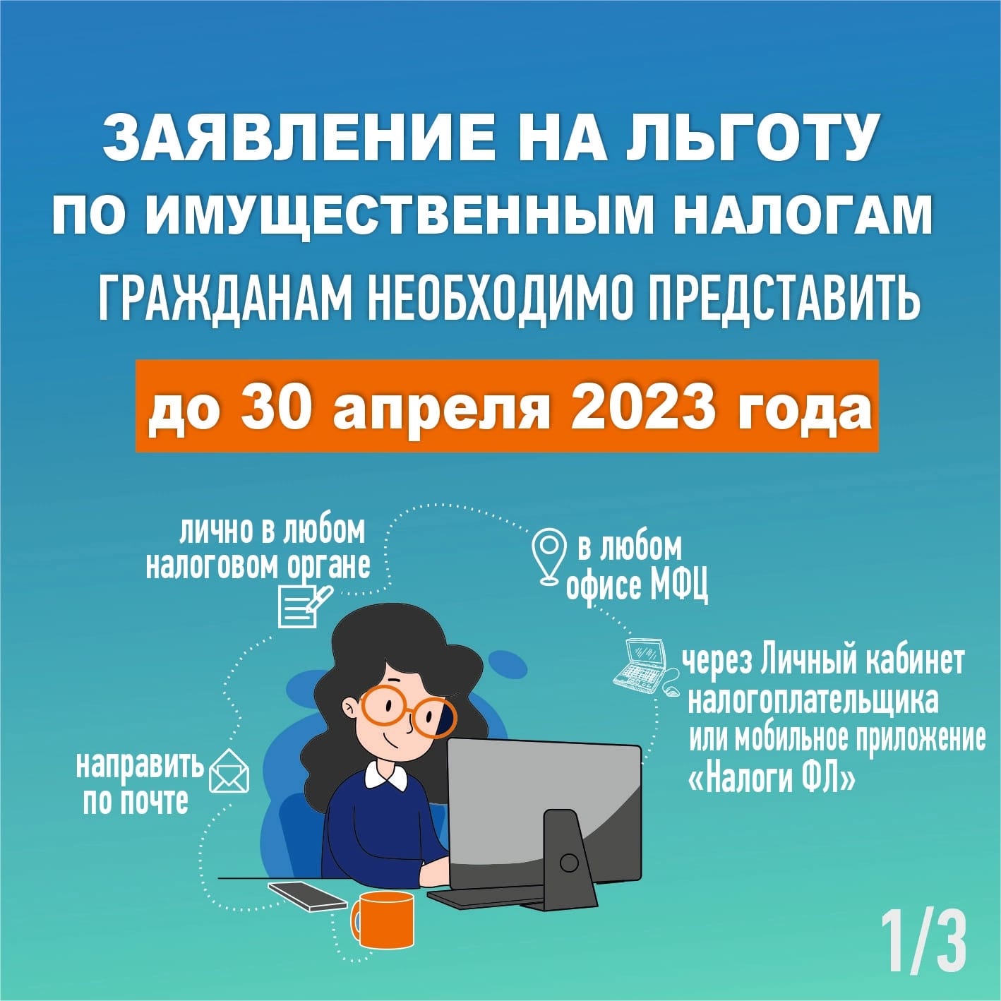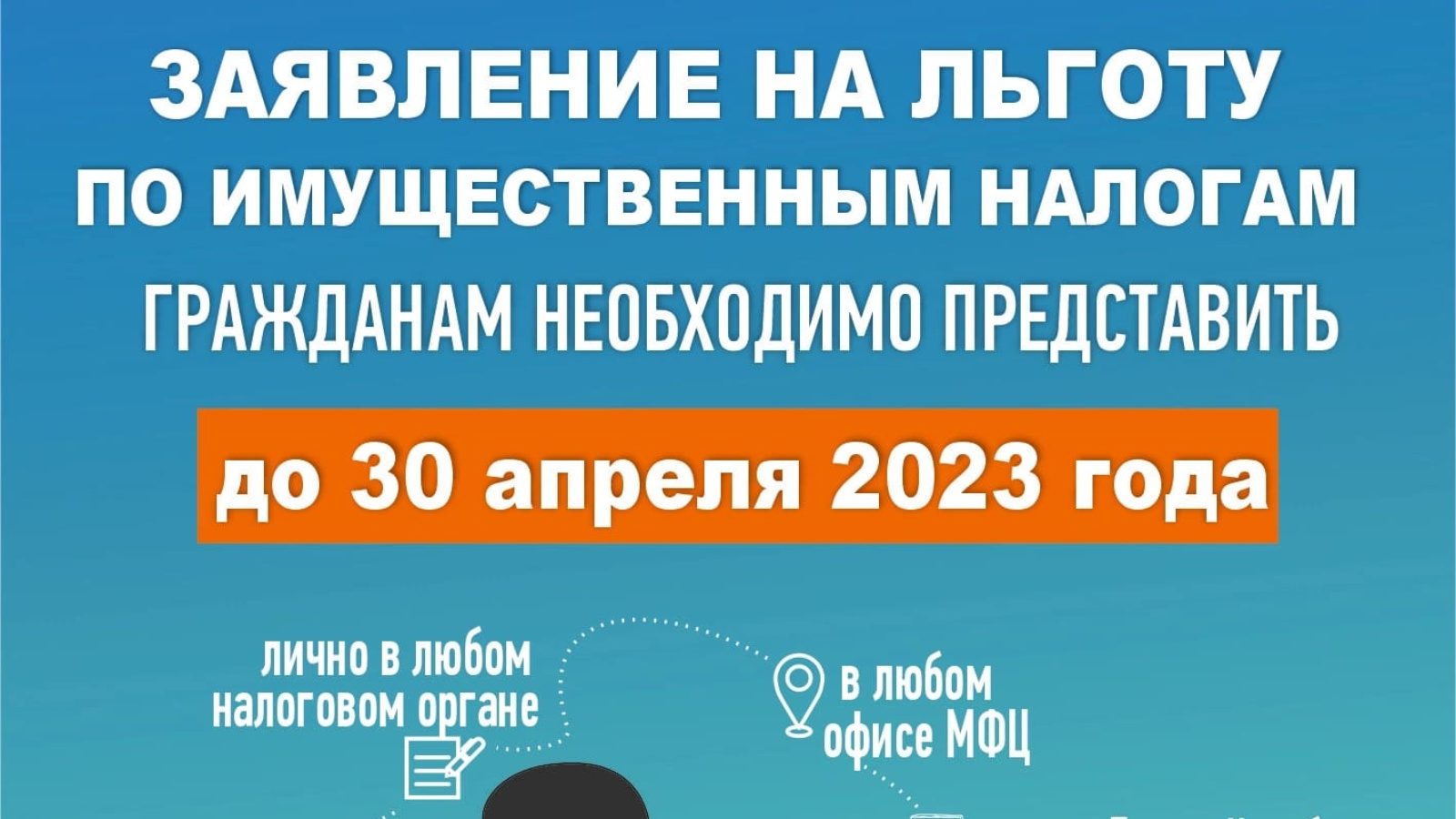 Федеральная налоговая служба рекомендует предоставить заявление на льготу по имущественным налогам до 1 мая 2023 года для учета льготы при исчислении имущественных налогов до направления налоговых уведомлений за 2022 год.