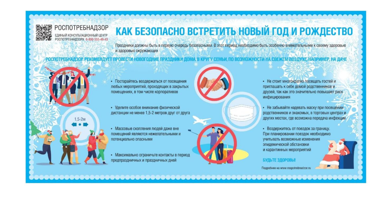 В условиях сохранения рисков распространения новой коронавирусной инфекции Роспотребнадзор напоминает, что встреча Нового года и предстоящие длительные праздники должны быть в первую очередь безопасными. В этот период необходимо быть особенно внимательными к своему здоровью и здоровью окружающих.