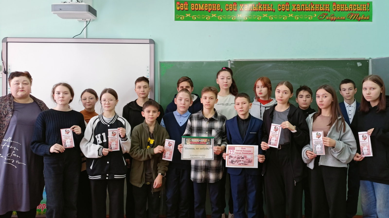 27 января 1944 года была прорвана блокада Ленинграда, которая продолжалась 900 долгих дней и ночей. К этой исторической дате для учащихся старших классов Аланской средней школы проведен патриотический час «Путь к победе: непокоренный Ленинград». Библиотекарь рассказала ребятам о тяжелых испытаниях, выпавших на долю жителей осажденного закрытого города Ленинграда: о голоде и холоде, о детях и женщинах, работавших наравне с мужчинами на заводах, о защите и обороне Ленинграда советскими солдатами. Особенными чувствами ребята прониклись к судьбе маленькой девочки Тани Савичевой. Её дневник стал одним из символов Великой Отечественной войны. Так же вниманию учащихся была представлена книжная выставка. Учащиеся познакомились с рассказом татарской писательницы, нашей землячки Дании Гайнутдиновой “Хәтер ни дияр?”, из которого узнали о героизме и стойкости нашего народа. Ребята с интересом просмотрели видеоролики, наглядно показывающие тяжелую жизнь ленинградцев в те нелегкие для всей страны времена. В заключении мероприятия минутой молчания почтили память ленинградцев, погибших во время блокады. Учащимся были розданы тематические буклеты.
