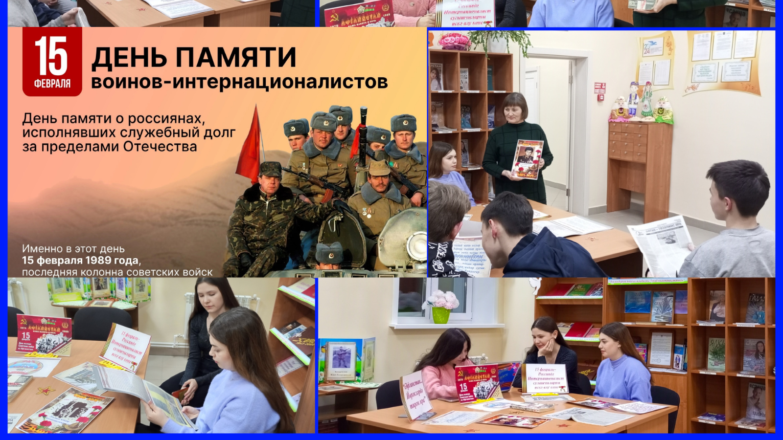 В этот день страна отдает дань уважения воинам- «афганцам» и другим ветеранам боевых действий, кто прошел «горячие точки» в различных районах земного шара. 15 февраля к памятной дате в Айдаровской сельской библиотеке подготовлена книжно-иллюстративная выставка «Әфганстан...Йөрәкләрдә тирән яра». Вниманию посетителей представлена литература, повествующая об афганских событиях: документальная хроника, свидетельства очевидцев и участников афганской войны, газетные публикации о наших земляках, выполнявших боевой долг, художественные произведения. Эта выставка, как дань памяти всем тем, кто воевал в Афганистане, и тем, кто с честью нес и продолжает нести звание «воин-интернационалист». В библиотеке с молодежью проведен патриотический час «Әфганстан яши күңелдә». Библиотекарь рассказала о наших односельчанах, которые участвовали в войне и выполняли служебный долг за пределами родины, ознакомила с альбомом “Әфган кайтавазы мәңгелек”. Эта война навсегда останется в памяти, она будет жить в стихах и воинских песнях, напоминая о ненужности войны, о ее трагизме и мужестве советского солдата. Мужество и героизм наших воинов вечны и всегда заслуживают глубокого уважения!