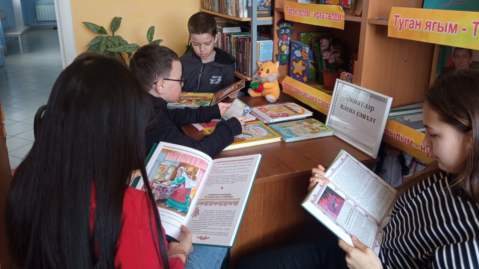 Библиотекарь познакомила детей с татарскими, русскими, болгарскими народными сказками, размещенными на выставке. Ученики читали вслух понравившиеся книги, а также выписали их домой для домашнего прочтения.