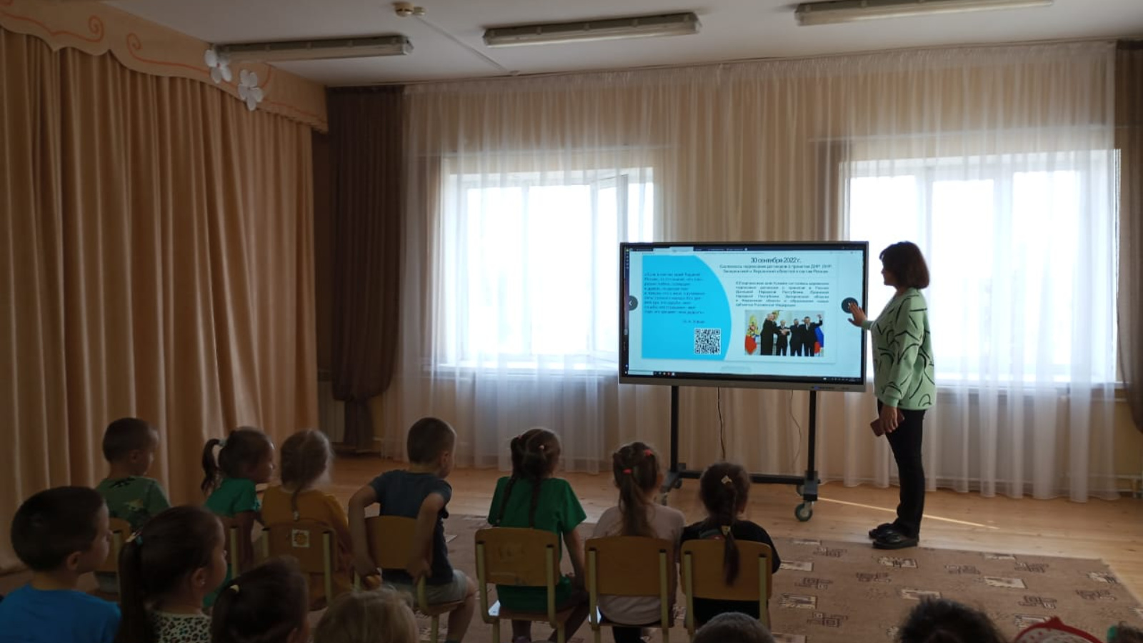 30 сентября в нашем детском саду с воспитанниками подготовительной группы проведена беседа по теме: "Одна семья. Одна страна.Одна Россия", посвящённое памятной дате воссоединение Донецкой Народной Республики, Луганской Народной Республики, Запорожской области и Херсонской области с Российской Федерацией. В ходе беседы детям рассказали об истории нашего государства, закрепили их знания о малой Родине и нашей великой стране. Просмотрели презентацию. Дети исполнили вместе с педагогами песню "С чего начинается Родина!"
