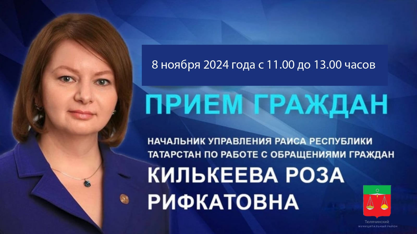 8 ноября 2024 года с 11.00 до 13.00 часов будет проведен личный приём граждан начальником Управления Раиса Республики Татарстан по работе с обращениями граждан Розой Рифкатовной Килькеевой.