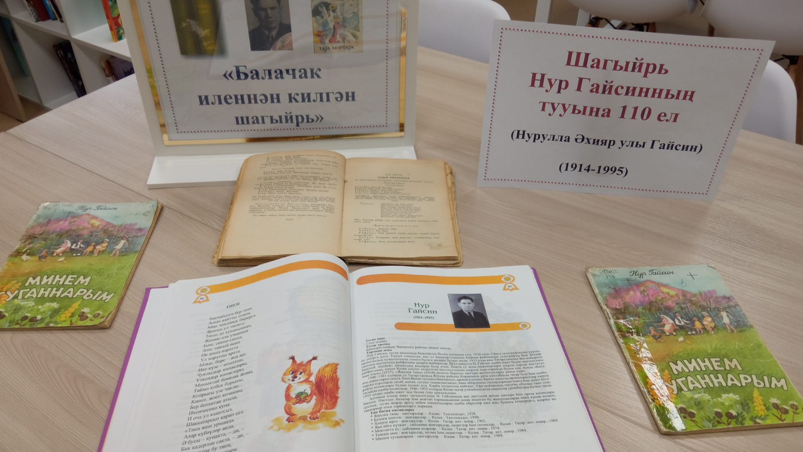 На выставке были представлены книги, рассказывающие о жизни и творчестве Нура Гайсина, такие как «Мечта, полная надежд», «Силач Муртаза; сказка–поэма», «Много у меня родных», «Наша школа», «Лунный вечер» и другие сборники стихов. Читатели смогли взять с собой любую понравившуюся книгу для домашнего чтения.