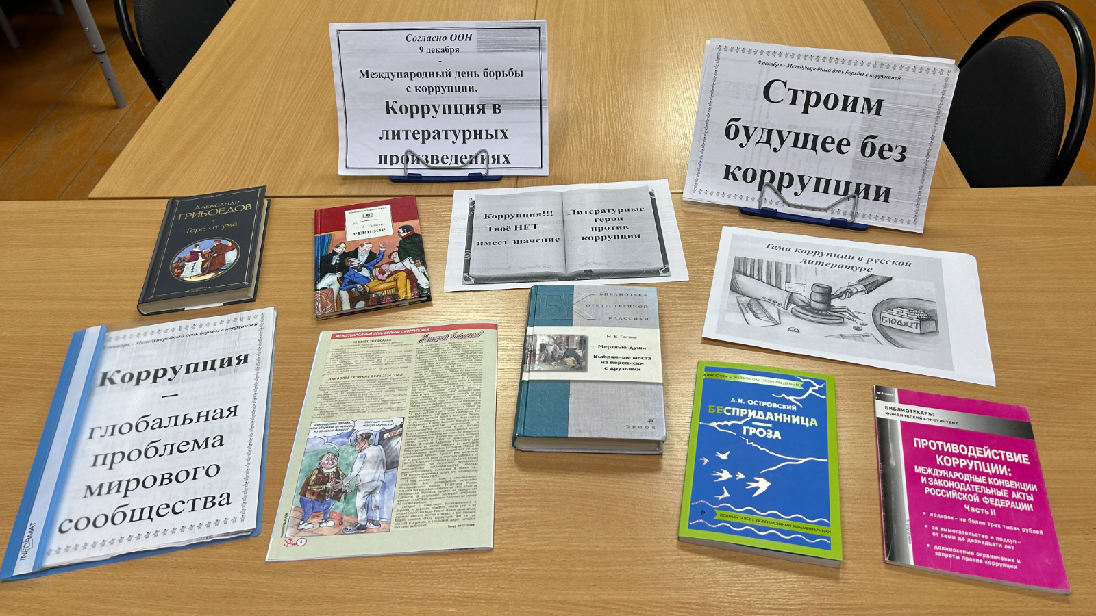 Особое значение приобретает активное участие каждого из нас в укреплении принципов справедливости, прозрачности и ответственности. Именно это способствует снижению уровня коррупции и укреплению стабильности в обществе. 9 декабря в Тюлячинской межпоселенческой библиотеке была организована информационная выставка под названием «Строим будущее без коррупции», посвящённая актуальной теме борьбы с коррупцией. На выставке читателям были представлены материалы из периодических изданий, раскрывающие проблемы коррупции и взяточничества, а также произведения художественной литературы. Особое место заняли классические произведения, глубоко и многогранно отражающие тему коррупции: «Ревизор» и «Мёртвые души» Н. В. Гоголя, «Бесприданница» и «Гроза» А. Н. Островского, а также «Горе от ума» А. С. Грибоедова. Благодаря этим произведениям читатели смогут научиться понимать моральные проблемы в обществе и противостоять им.