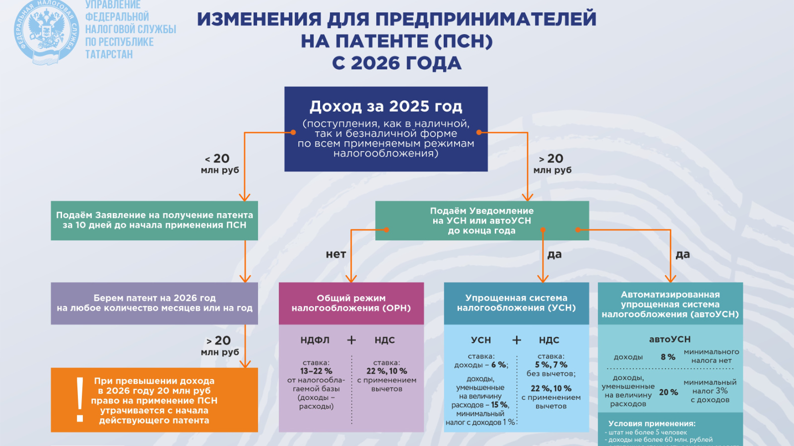 При этом лимит в 20 млн рублей становится актуальным и для 2026 года: его превышение приведёт к потере права на ПСН. Для тех, кто не может определить лимит, возможно оформление патента не на год, а поквартально или помесячно — тогда в случае превышения 20 млн рублей право на ПСН будет утрачено только с начала того периода, на который выдан последний патент.